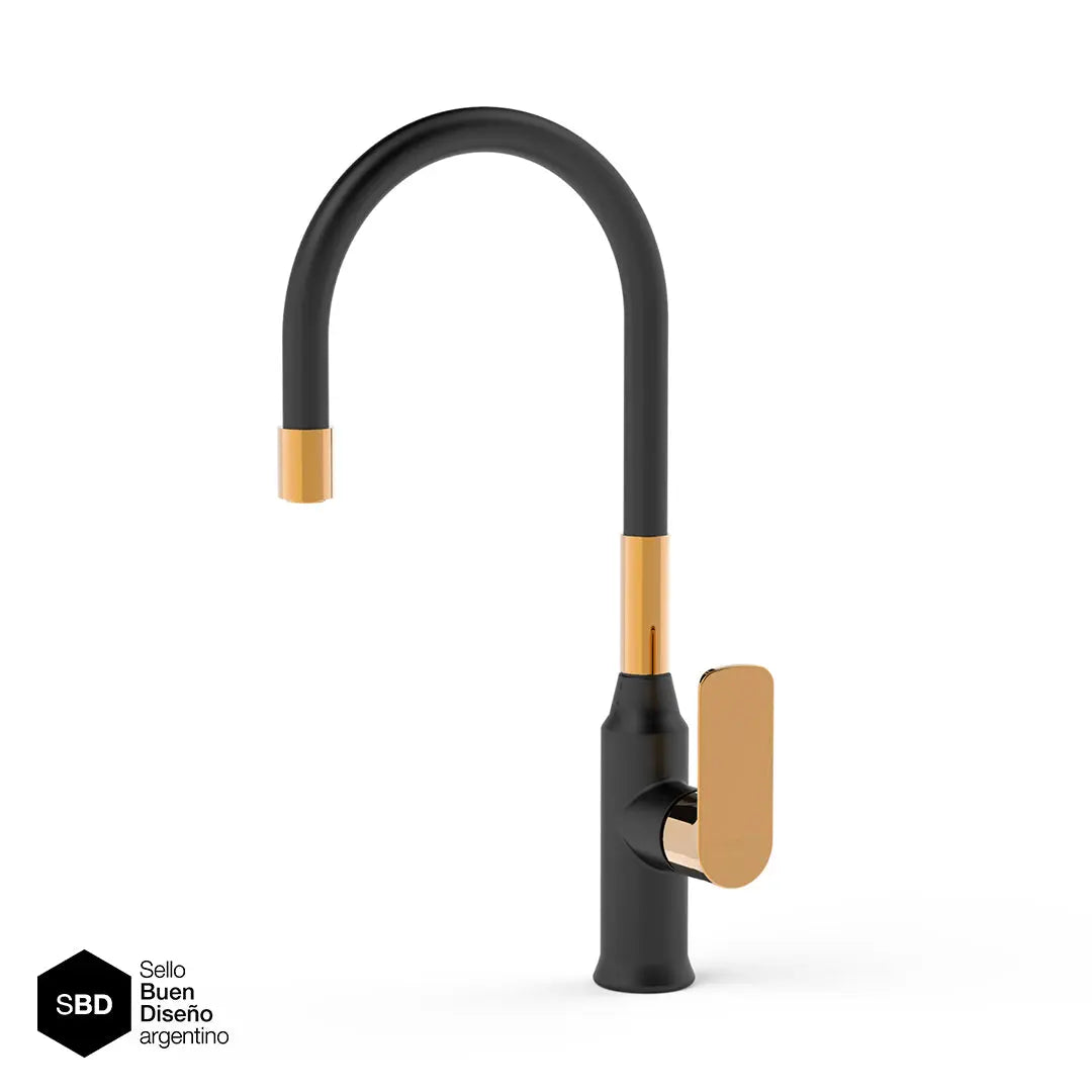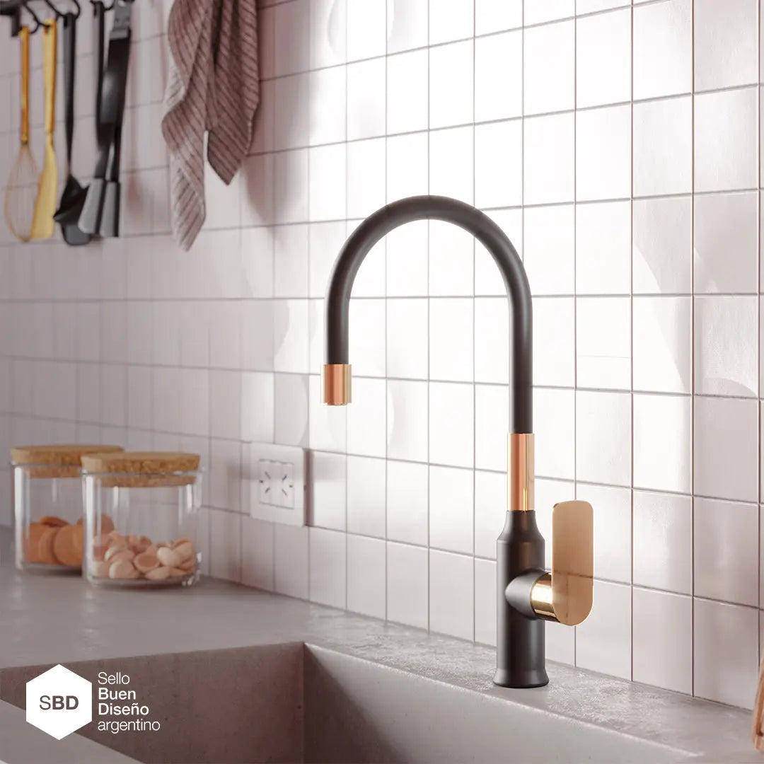 - Juego monocomando para mesada de cocina con pico móvil flexible black & gold